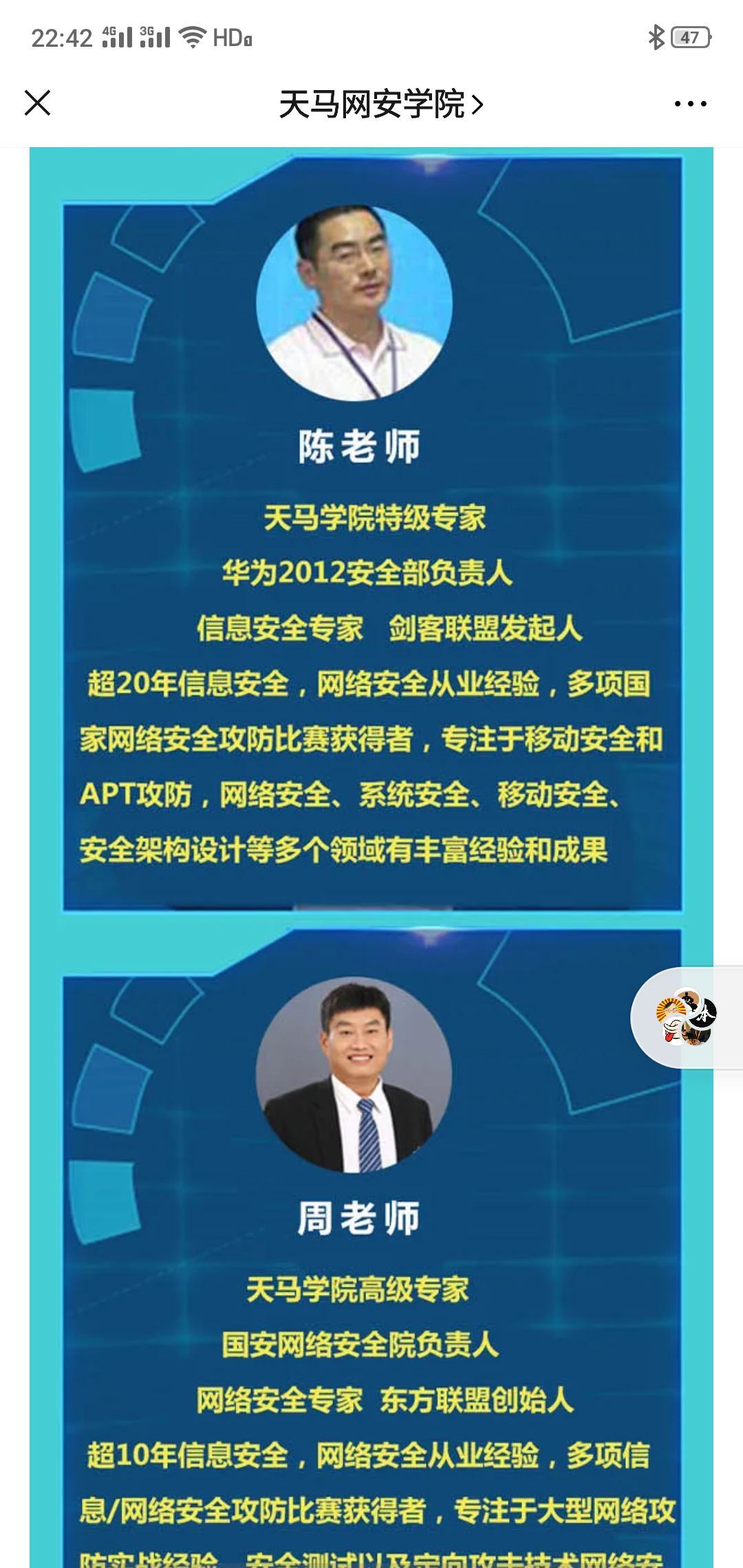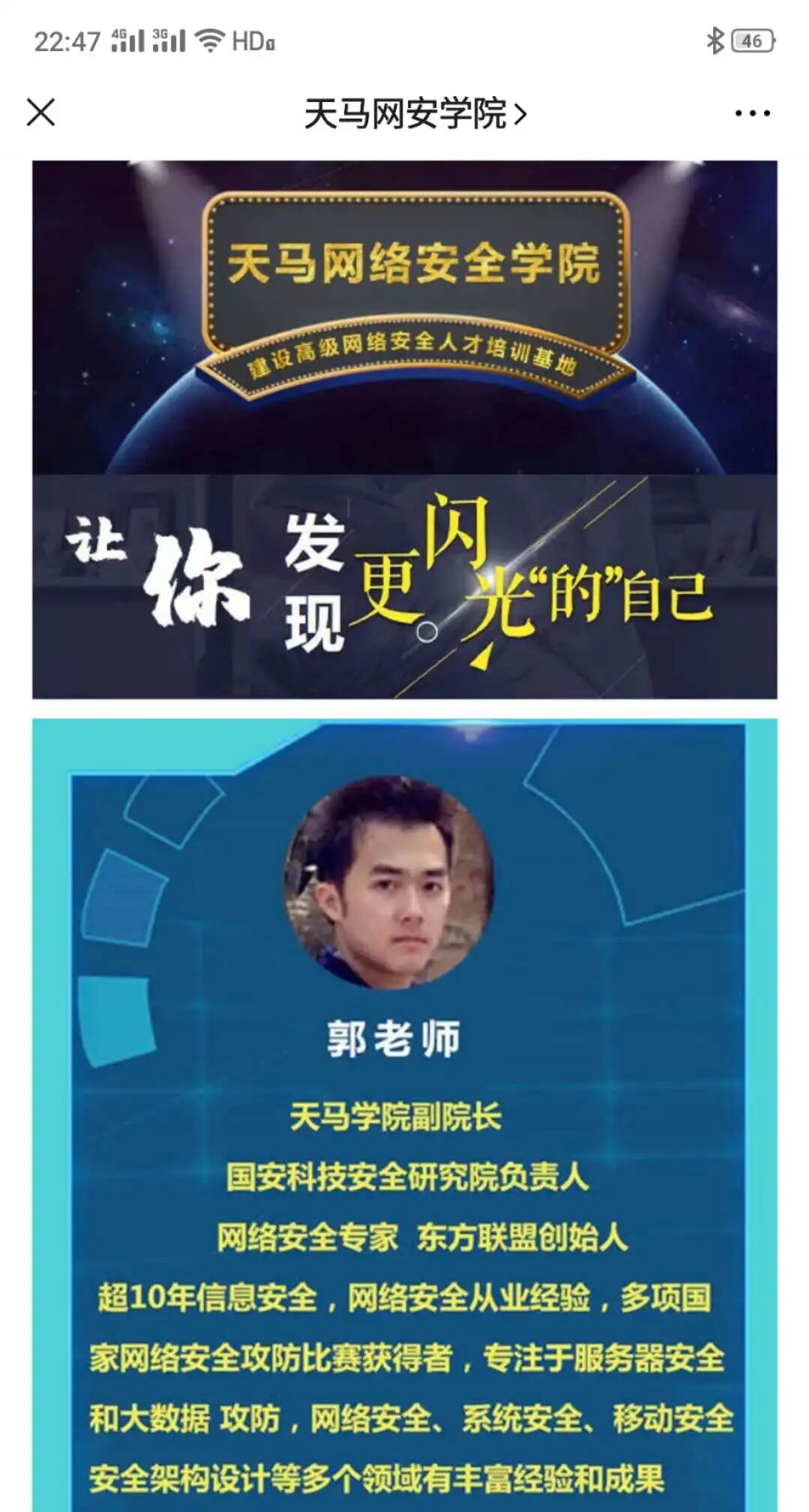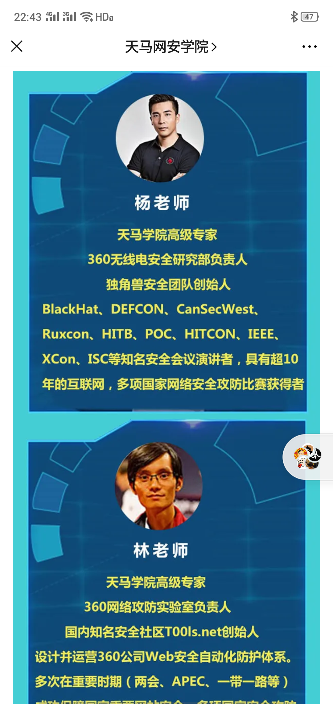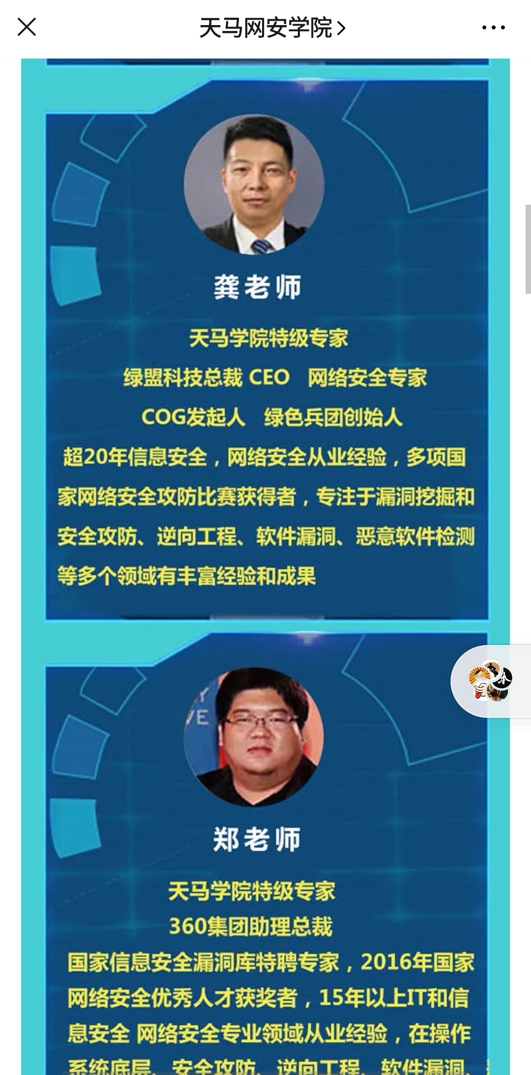 抛弃了之前小作坊郭先生个人明星式,全新换代采取学院式割法,强行圈内安全大佬都是讲师,组了一个安全学院课。说实话,除掉郭盛h,其他很多人我都眼熟,也不知道他们知道自己成为“天马讲师”是个什么心情,竟然还想采访一下。
