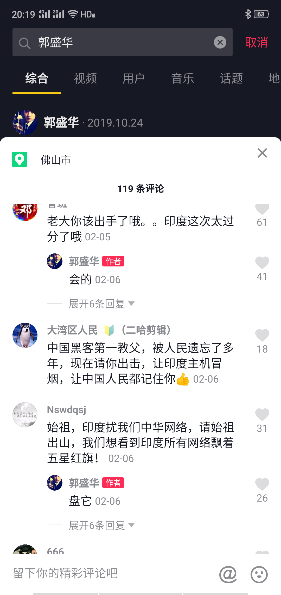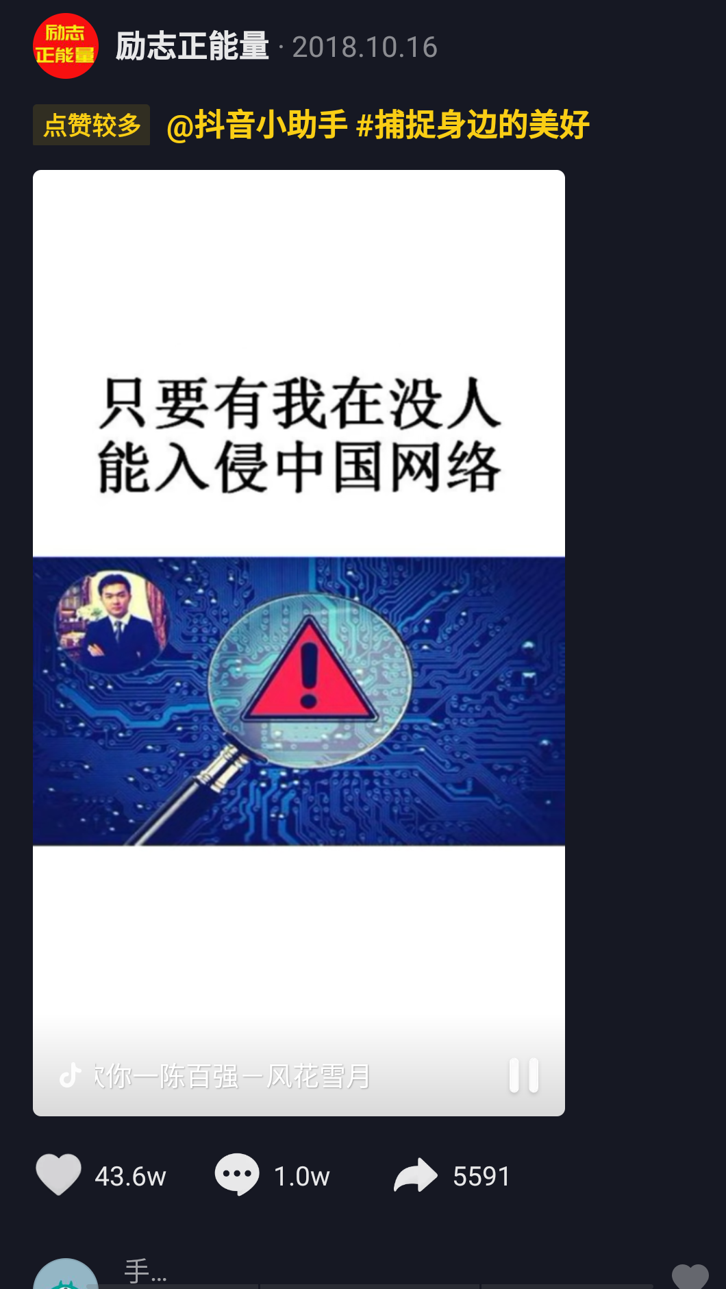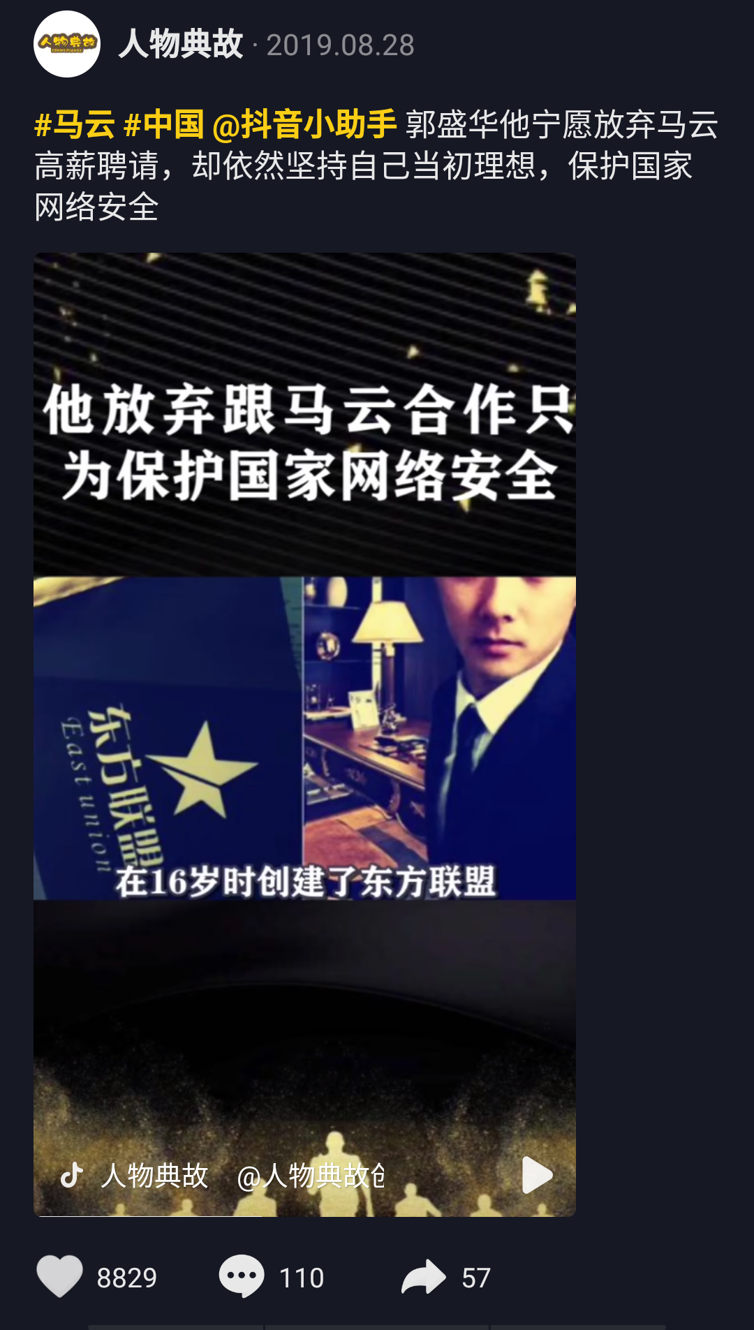 该条抖音还在,还有43.6w赞,1w的评论。去年关于郭先生有很多抖音,几十百万赞都很多高赞,郭先生名言:只要有我在,没人能够入侵中国网络!说实话,要不是火锅我就在安全圈,我看见这个视频也是要膜拜的,是个“英雄”。