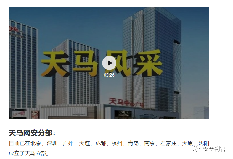培训机构是:某马网络安全,自称是由国内顶尖七大安全行业巨头企业(360、绿盟、华为、启明、国安、蚂蚁金服、深信服)联合创办!龟龟,名头真是大的不要不要的啊。好吓人啊!接着又说自己好多分部,放上了宣传视频: