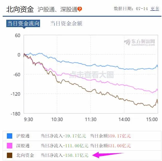 深股通净流入-111亿,沪股通净流入-39亿,北向资金合计净流入-150亿