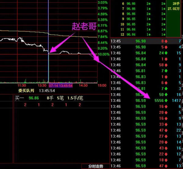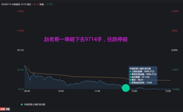 点评:通过同花顺L2超级盘口回放,赵老哥9714手一单下去砸跌停,这股他应该是中长线性质的股,然后看形态破位,今天没有收回去的可能,然后就毅然决然的砸掉了,所以,大资金的纪律性非常强悍,砸起盘来非常果断。