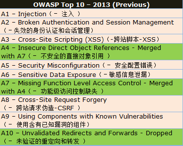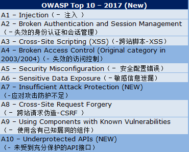 2013年版中A4 – 不安全的直接对象引用(Insecure Direct Object References)与A7 –功能级访问控制缺失(Missing Function Level Access Control)合并成为2017版中的新A4 –失效的访问控制(Broken Access Control)